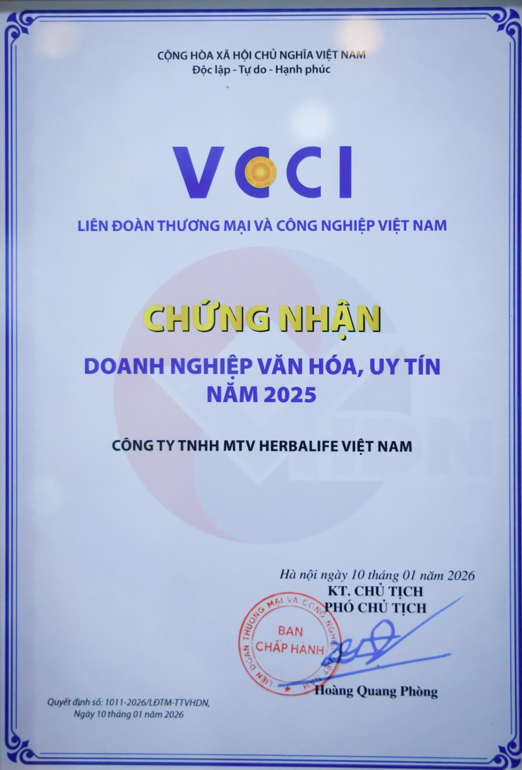 Ông Vũ Văn Thắng, Tổng Giám đốc Herbalife Việt Nam và Campuchia, cho biết: “Chúng tôi rất tự hào được Liên đoàn Thương mại và Công nghiệp Việt Nam vinh danh là “Doanh Nghiệp Văn Hóa, Uy Tín” năm 2025. Sự ghi nhận này là một minh chứng nữa cho cam kết lâu dài của Herbalife trong việc hoạt động liêm chính, nuôi dưỡng văn hóa doanh nghiệp tích cực và toàn diện, đồng thời đóng góp có trách nhiệm cho cộng đồng địa phương. Chúng tôi sẽ tiếp tục phát huy văn hóa kinh doanh của mình và luôn ưu tiên góp phần nuôi dưỡng sức khỏe và hạnh phúc của con người và cộng đồng thông qua dinh dưỡng cân bằng và lối sống năng động lành mạnh”.